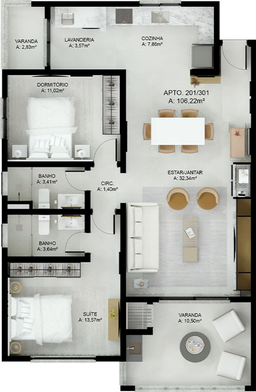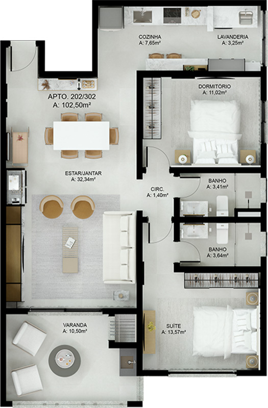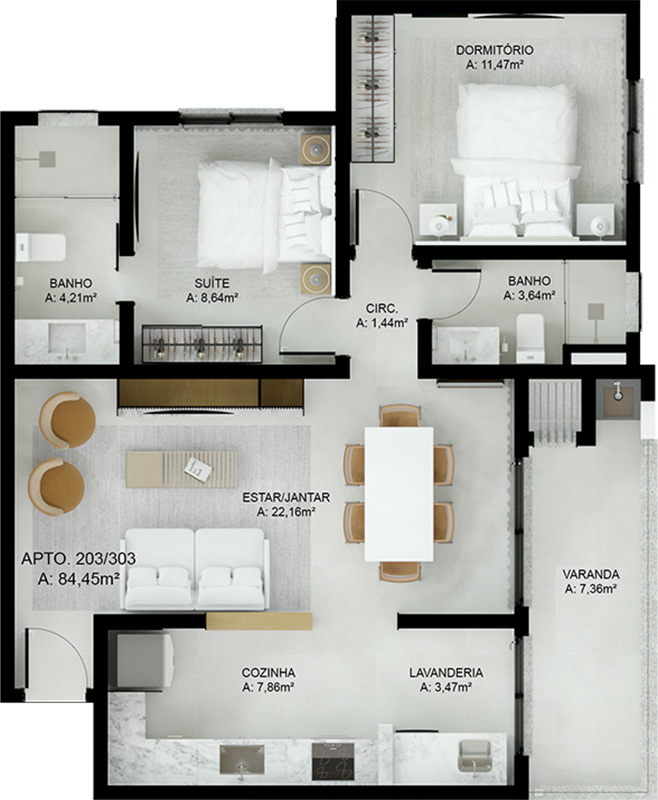 – Suíte + 1 Dormitório: A combinação ideal de privacidade e espaço.